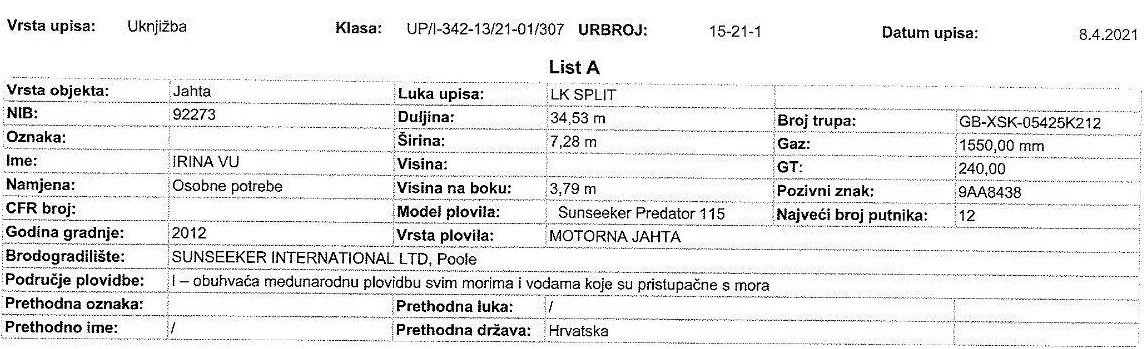 Jahta Irina VU je 2012. godine registrirana u Splitu. Od tada ju se često moglo vidjeti u hrvatskim lukama od Dubrovnika preko Korčule i Orebića do Splita i elafitskog otoka Olipa. Danas se jahte takvog ili sličnog tipa te istoga godišta na internetskim stranicama kao što je Yacht World prodaju za oko 5 milijuna eura.