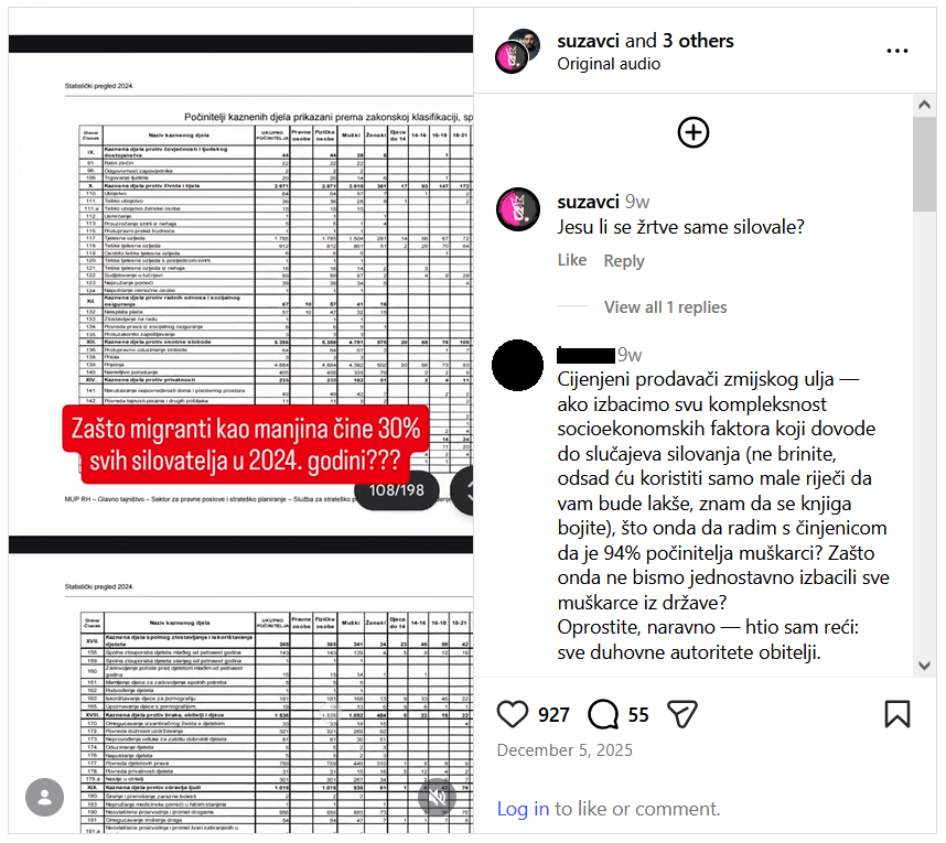 Uz sadržaj na stranici, Suzavci na svom Instagram profilu imaju više od 300 objava, od kojih jedna prikazuje tablicu »Počinitelji kaznenih djela prikazani prema zakonskoj klasifikaciji, spolu i dobi« iz MUP-ovog statističkog pregleda 2024. godine. Specifično, u tekstu ispisanom preko videa stoji da »migranti kao manjina čine 30 posto svih silovatelja u 2024. godini.«