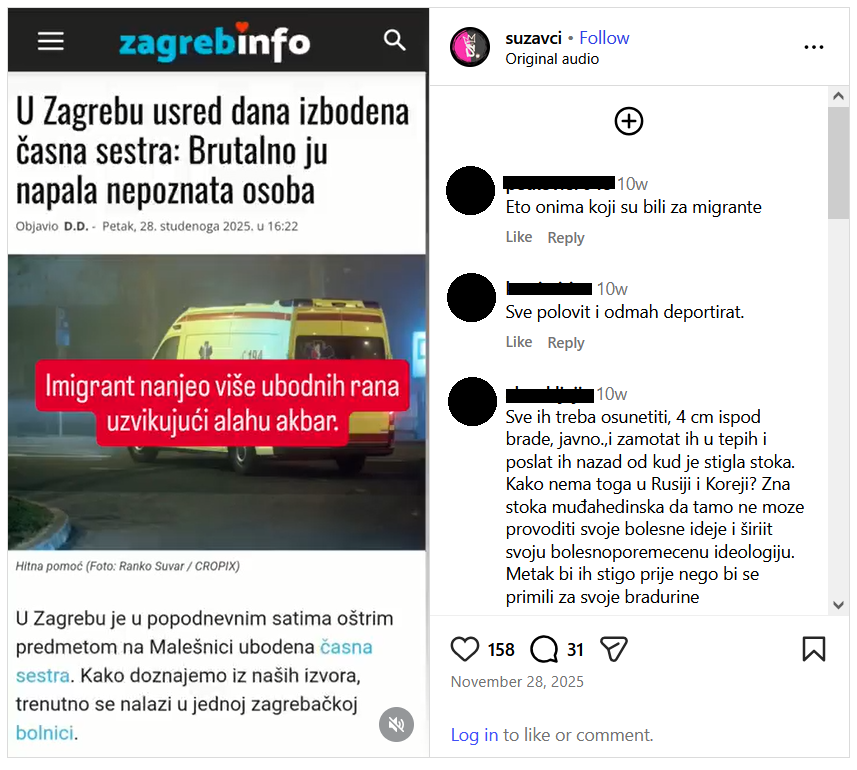 U prosincu prošle godine na društvenim mrežama i određenim portalima pojavila se vijest o napadu na časnu sestru koji je, prema prvim i neslužbenim informacijama, počinio strani državljanin. Suzavci su podijelili snimku zaslona jednog od članaka napisanih na tu temu, a uz nju stoji tekst »imigrant nanio više ubodnih rana uzvikujući allahu akbar.«